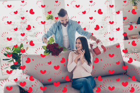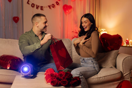 Loving man giving bag to surprised woman, sitting on couch in room filled with heart decorations, Valentines day, anniversary or romantic date