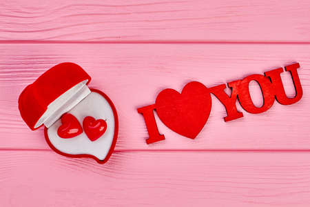 I love you inscription, top view. Red gift box with heart shaped earrings and text I love you on colorful wooden background. Love confession concept.
