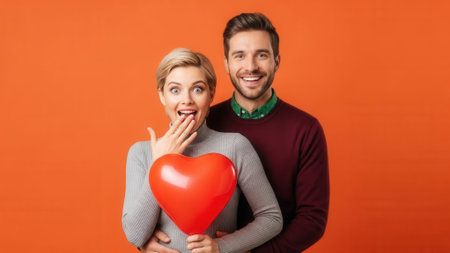 A happy, surprised couple, a man and a woman, holding a red heart balloon against an orange backdrop.