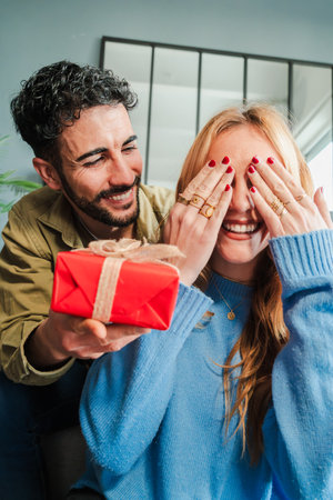 Vertical. Young couple celebrating together their relationship anniversary, birthday or valentines day. Loving man giving a romantic surprise gift with a ribbon while his happy