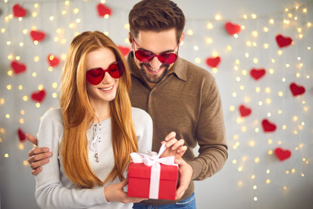 Loving young couple in red glasses in the shape of a heart unpacks a gift for Valentines Day. Husband gives a gift to his wife standing on a background of garlands and hearts. Blurred background.