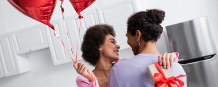 Smiling african american woman holding balloons and gift box while embracing boyfriend in kitchen, banner