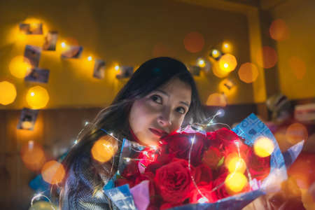Girl with a bouquet of roses and bokeh lights On valentines day