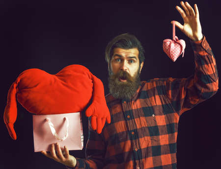 bearded man with heart and package on black background
