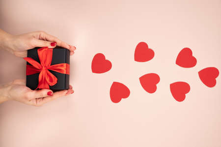 Gift box wrapped in black paper with red ribbon in female hand on pink surface. Flying red hearts symbol of love Valentine's Day concept. ... High quality photo