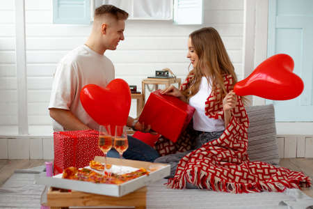 Young couple in love exchanges gifts for Valentine's Day holiday. They celebrate at home with pizza and glasses of wine in a cozy atmosphere. enjoying moment. love emotions. Balloon hearts.