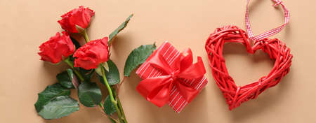 Red rose flowers, gift box and decor on color background. Valentine's day celebration