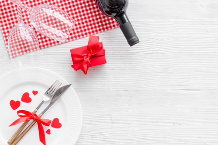 Romantic dinner on Valentines Day. Wine, plate, present box on white background top-down copy space