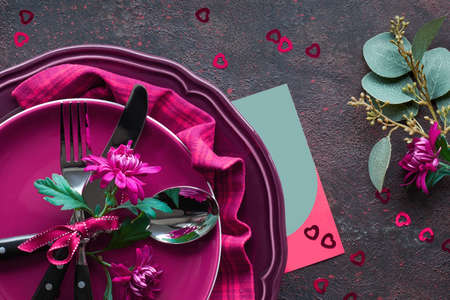 Festive table setting for Valentines Day celebration on dark wooden background
