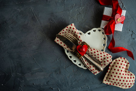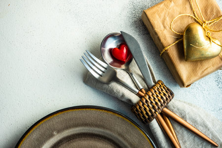 Festive table setting for St. Valentine day concept with hearts, cutlery and gifts on concrete background with copy space