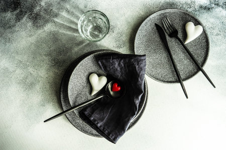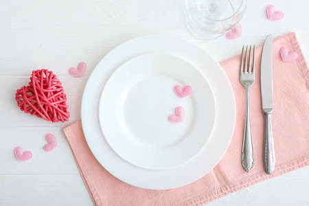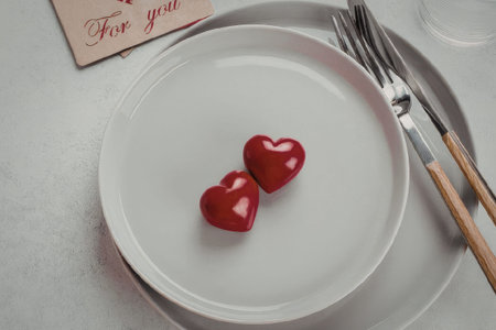 Place setting for St. Valentine holiday dinner decorated with hearts on white and gray concrete background