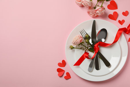Concept of Valentine's day with cutlery, roses and ribbon on pink background