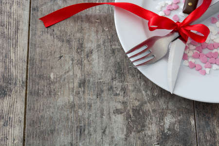 Valentine Dinner. Valentine candies with heart shape on a white plate, knife and fork on wooden table.