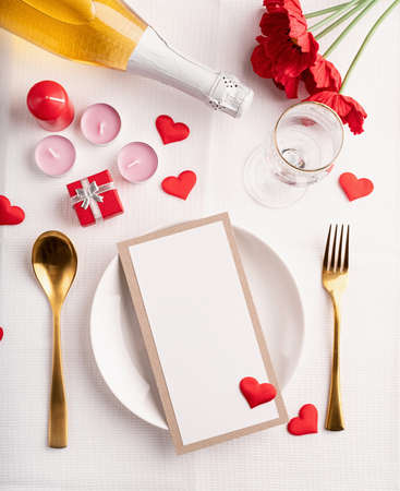 Valentines day table setting with menu, plate, bottle of champagne top view, mock up design