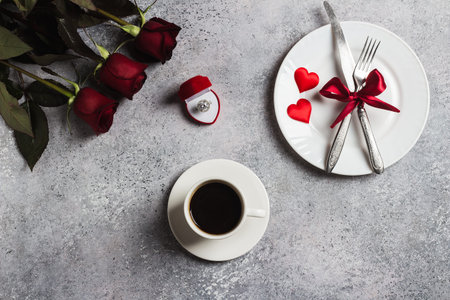 Valentines day romantic dinner table setting marry me wedding engagement ring in box with red rose gift cup of coffee surprise on grey background with copyspace. Love flower gift woman making proposal