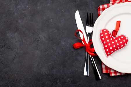 Table setting for St. Valentines day dinner on stone background with copy space