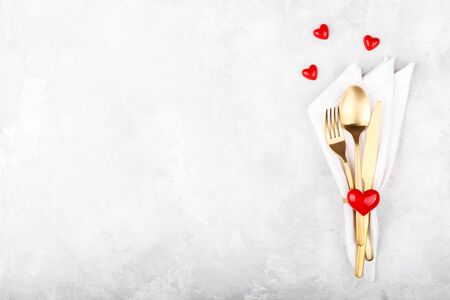 Romantic table setting with golden cutlery on white stone table.Valentine's day card template