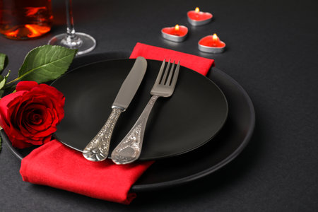 Beautiful table setting for Valentine's Day on dark background