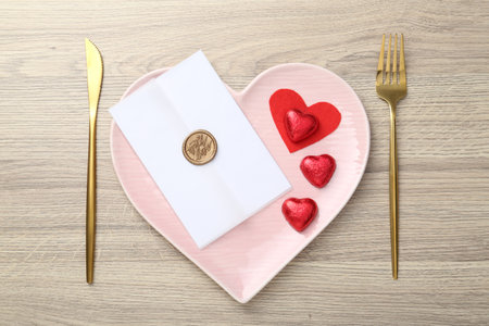 Romantic place setting with cutlery and heart-shaped plate on wooden table, top view. Valentine's day celebration
