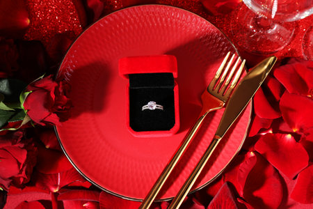 Engagement ring in box, tableware, rose flowers and petals on red glitter background, flat lay. Table setting for romantic dinner