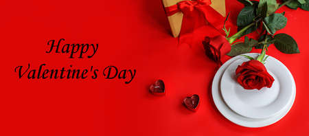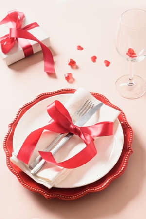 Empty white plate with tableware, ribbon, gift and roses for Valentine's Day special holiday dating meal concept.