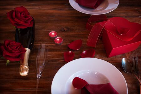 Romantic valentines day table setting with a surprise gift, champagne, red roses and candles decorated on old wooden table. Invitation for two.Top view.