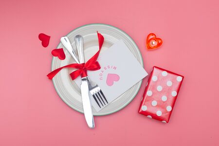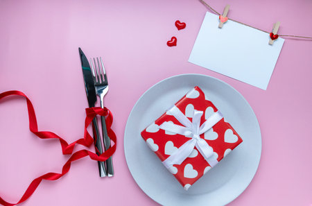 Romantic dinner table. Gift or present box, greeting card, mini heart, plate, fork and knives with ribbon on pink background. for banner. The concept of Valentine Day. top view, copy space