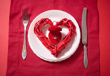 Marriage proposal and engagement concept. Table setting for Valentine's day, wedding cutlery, romantic dinner, declaration of love, love confession, date. Vintage tableware on the red background with heart-shaped lights, heart-shaped napkin ring, red wooden heart, red velvet ring box, red linen napkin, top view.