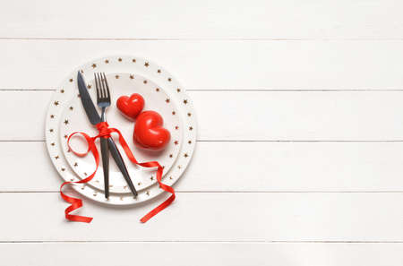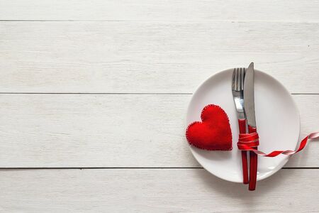 Empty white plate and cutlery. Valentine's Day theme. Place for text.
