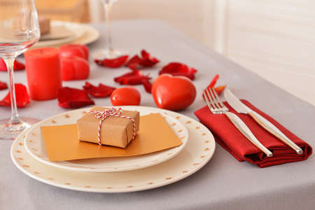 Romantic dinner table setting for two on Valentine's Day. Gift or present on a plate. Date in restaurant. Wine and candle.