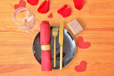 Valentines day table setting on a dark blue background. Black plate, golden cutlery and red hearts, romantic dinner concept