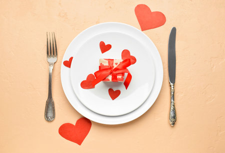 Beautiful table setting, present for Valentine's day and hearts on color background