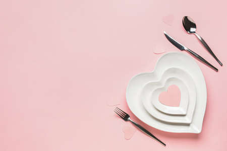 Valentines day background with empty plate and silverware. Top view flat lay with copy space