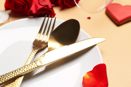 Table setting with cutlery and rose petal on beige background. Valentine's Day celebration