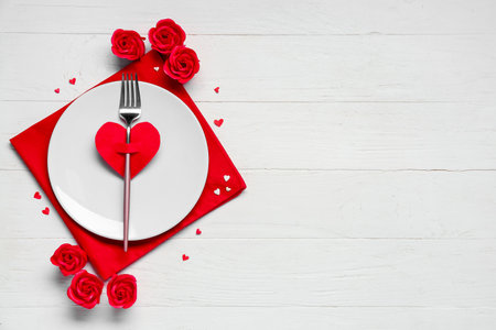 Beautiful table setting for Valentine's Day on white wooden background