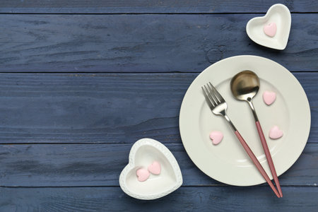 Beautiful table setting with hearts on blue wooden background. Valentine's Day celebration