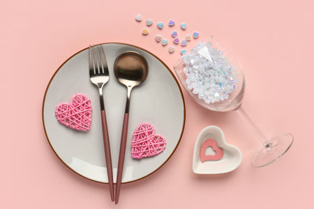 Beautiful table setting with glass and hearts on pink background. Valentine's Day celebration