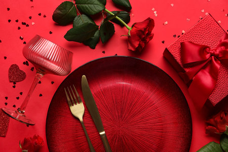 Stylish table setting and gift for Valentine's Day on a red background, top view.