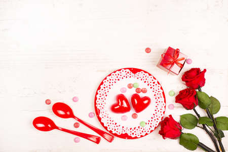 Beautiful table setting for Valentine's Day with decorative roses and hearts on white wooden background