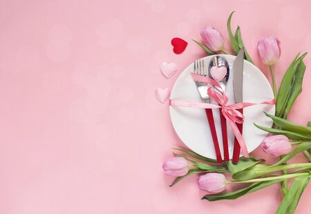 Festive table setting with cutlery, rosy tulips and hearts on pink table. Space for text. Top view.