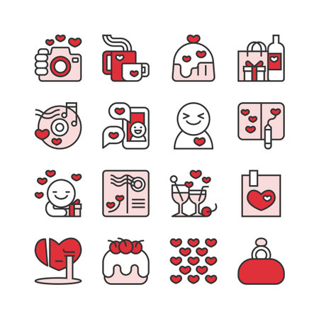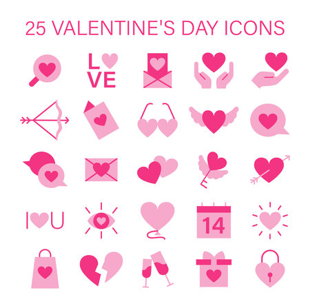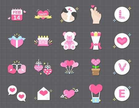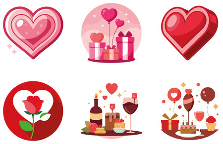 Valentines Day icon set capturing essence of love with hearts, gifts, and romantic symbols, ideal for expressing heartfelt emotions. Flat vector illustration.