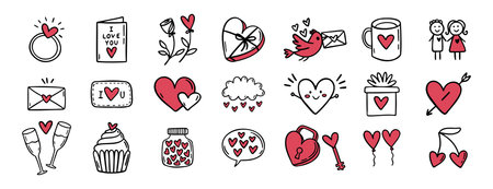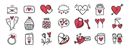 Valentine day love and hearts doodle hand drawn icon set. Outline drawing love line clipart symbol collection