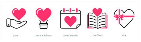 A set of 5 valentine's day icons as love, hot air balloon, love calendar