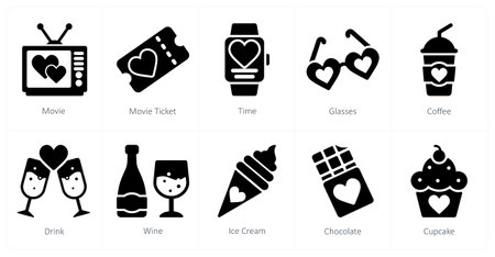A set of 10 Valentine's Day icons as movie, movie ticket, time