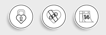 Set line Calendar with February 14 Castle in the shape of heart and Candy shaped box icon. Vector.