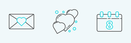 Set line Calendar with 8 March Envelope and Heart icon. Vector.