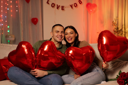 Happy European couple sitting on couch in cozy room filled with heart decorations, holding heart-shaped balloon and smiling at camera