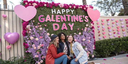 Three young women smiling and posing together at Galentines Day event with floral heart wall outdoors. Friendship celebration concept with pink decorations and happy mood.