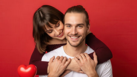 A joyful couple shares a tender moment, embracing warmly against a vibrant red backdrop, symbolizing love and connection.