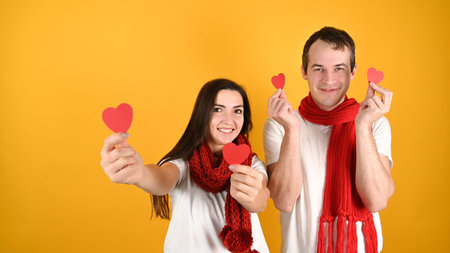 Man and woman with hearts in their hands, on a yellow background. High quality photo